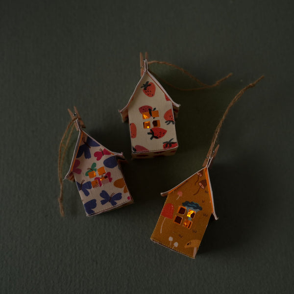 Each home is made with organic cotton fabric and lined with cardstock. Included with each home is an LED battery operated candle, small clothes pin and string for hanging.